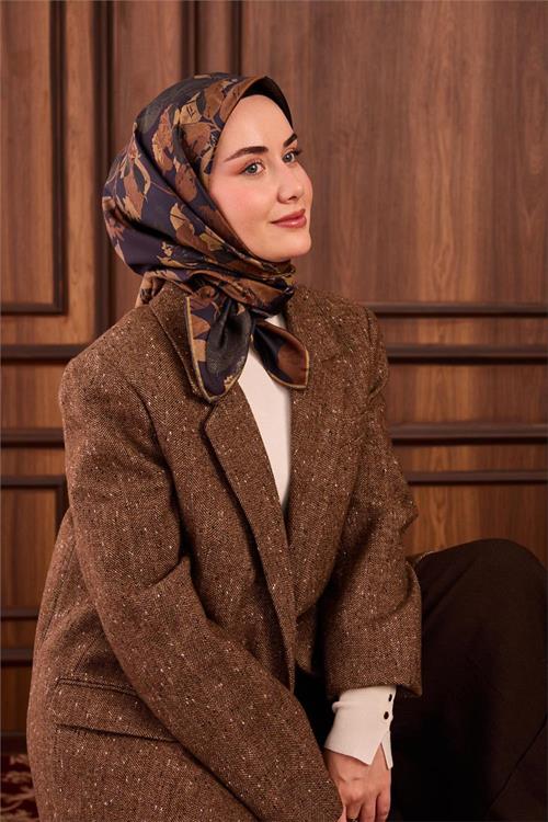 Twill İpek Eşarp Lacivert Çiçek Desen
